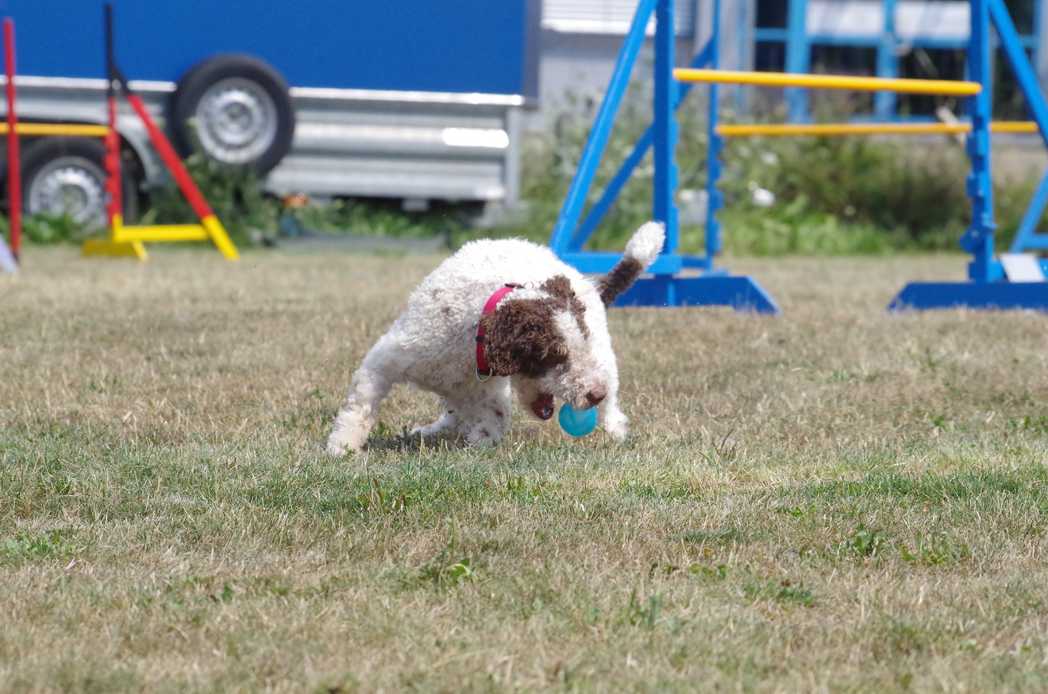 Teilweise lief Bonnie unkonzentriert (ein müdes Frauchen und hochsommerliche Temperaturen über 30 Grad) führte Frauchen zu nachlässig. Die Slalomeingänge waren teilweise richtig gut, dazwischen viele Baustellen, aber immer mit Spaß. Tempo, Arbeitswille und enge Wendungen sind nicht das Problem.