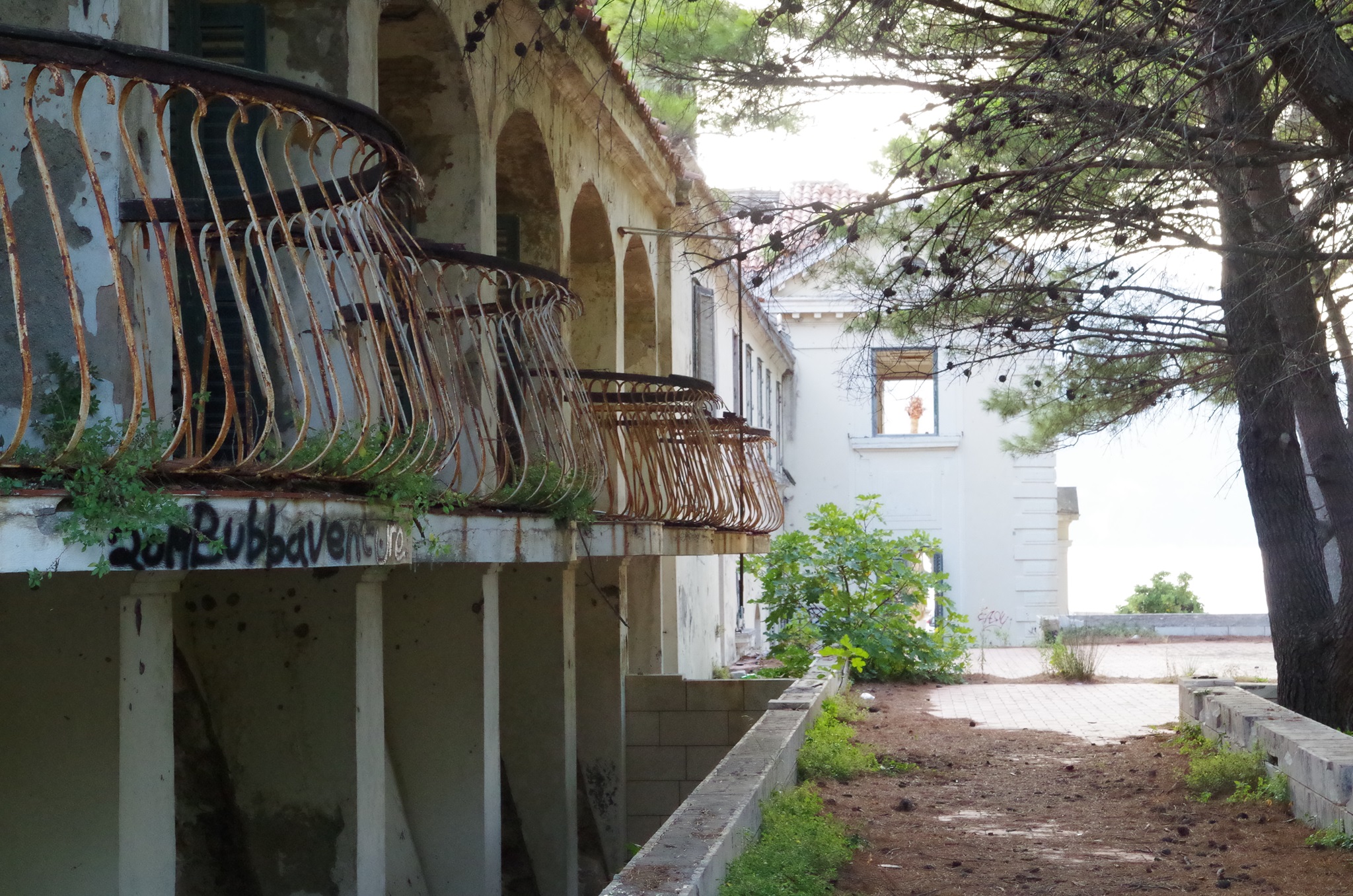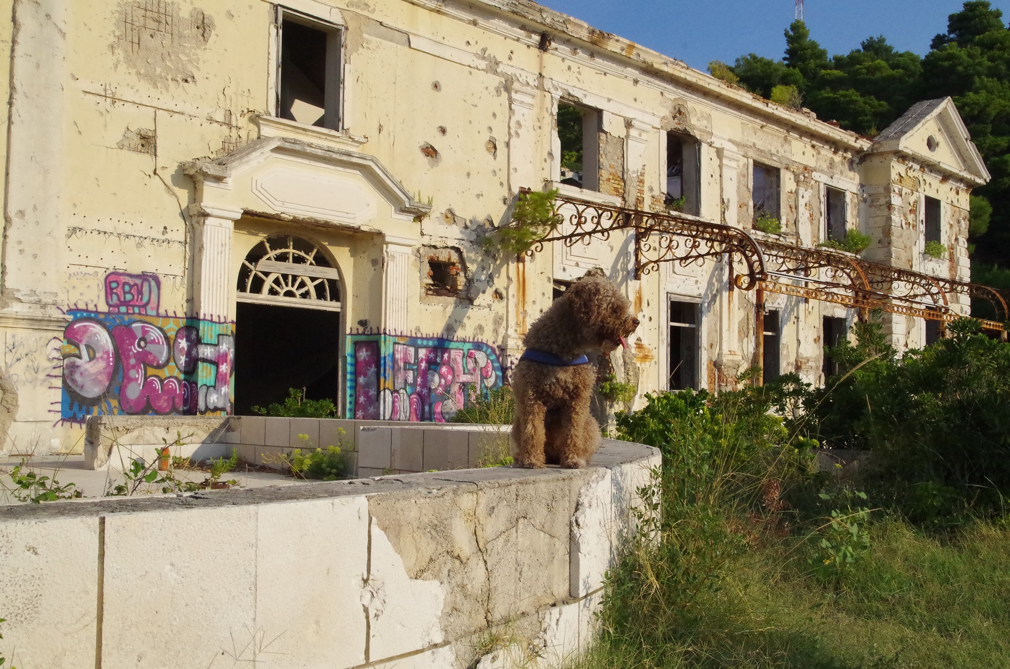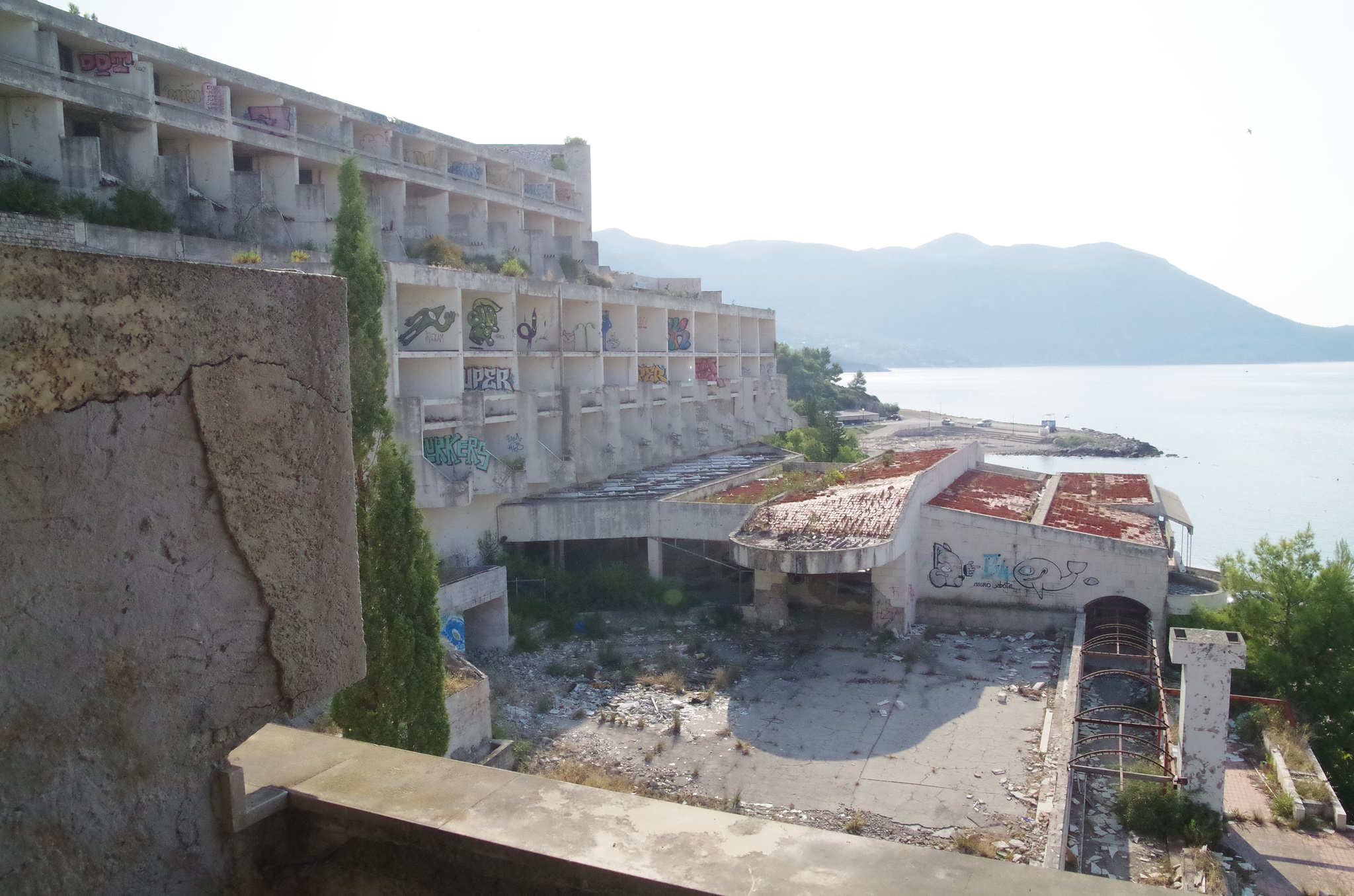 Wir fahren entlang der Küste über Dubrovnik nach Albanien. Dubrovnik hat sich mittlerweile zu einem Touristenzentrum entwickelt. Offiziell leben noch 1.500 Einwohner in der Stadt. Südlich von Dubrovnik liegt eine riesige zerfallene Hotelanlage und einer der schönsten Strände Kroatiens (daher wurden hier auch Hotels gebaut). Man kann nur erahnen, wie luxuriös und schön die Nobelhotels einst waren. Die Führungselite der Jugoslawischen Armee hat dort Urlaub gemacht. Selbst Tito hatte dort eine Villa. Die Hotels besitzen bis zu 600 Zimmer. Das erste Hotel wurde 1919 gebaut. 1984 wurde das letzte eröffnet, bis zum Stillstand im Jahr 1991 im Jugoslawienkrieg, das durch serbische Truppen zerstört wurde. Seither ist es leer. Metall wurde zur Rüstungsindustrie aus den Gebäuden geholt.