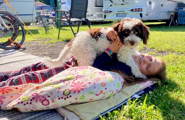 Campinghund Gino alias Fuego del Nortes Galeno hat Spaß pur.