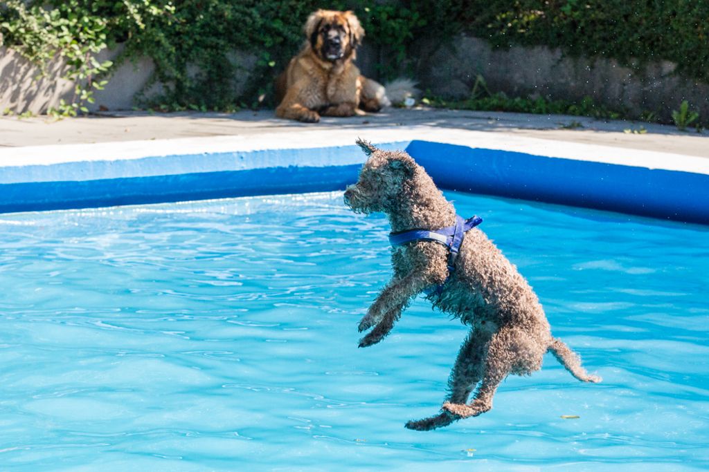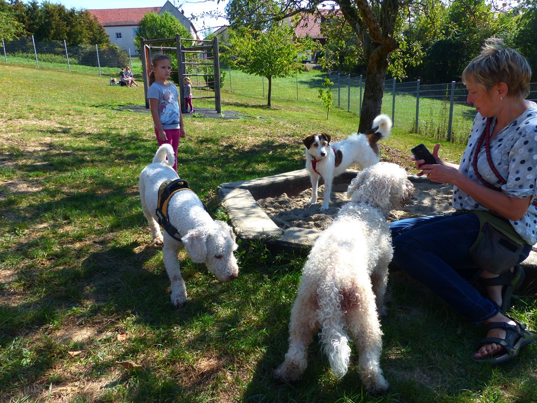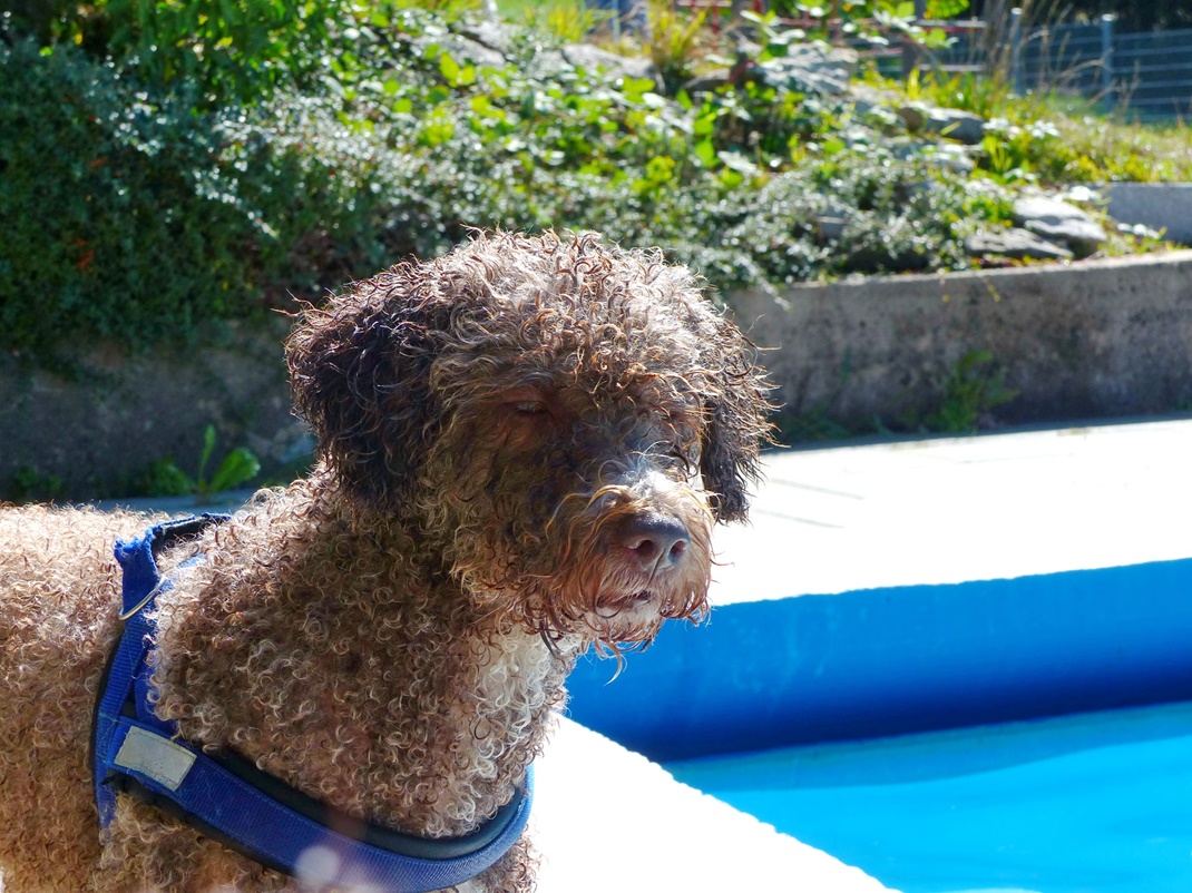 Nach den kühlen Nächten in letzter Zeit wurde die Wassertemperatur gerade mal 15 Grad gemessen. Das Wasser kommt ausschließlich aus einer Quelle. Frauchen war´s dann doch zu frisch. Die Hunde hatten einen Riesenspaß. Das Springen vom Beckenrand ist heute erlaubt :-) Emi stürzte sich in den sportlichen Konkurrenzkampf mit Mama Bonnie besonders im Kampf um den Ball und rennt, dass die Ohren fliegen. Unser Lockenflip Emilia teilt mit Leya die Begeisterung für Wasser, mit Bonnie hingegen die Jagd auf Bälle, wobei Emi ihre Technik perfektioniert hat und seitdem Bonnie nun den einen oder anderen Ballverlust hinnehmen muss. Um bei Leya an den Ball zu kommen, muss Emi aber noch einige Teller leer essen, denn Oma Leya ist ein kleines Kraftmonster, während Emi noch ein arger Spargeltarzan ist, obwohl sie es bei Oma leichter hat, die lässt sich doch irgendwie besser unterdrücken… Nach dem Baden und einem Stück Kuchen mit diversen Kaffees ging es für uns dann los in den Urlaub.