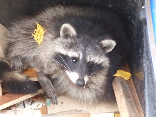 Wir haben einen neuen Mitbewohner. Ein kleiner Waschbär hat in der Restholzkiste in unserem Carport einen Schlafplatz gefunden.