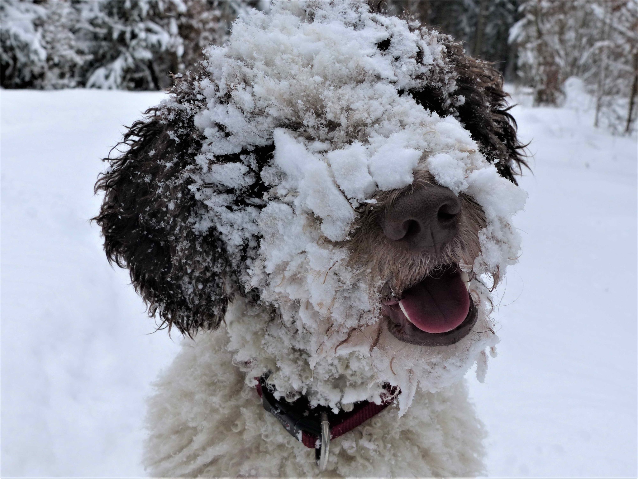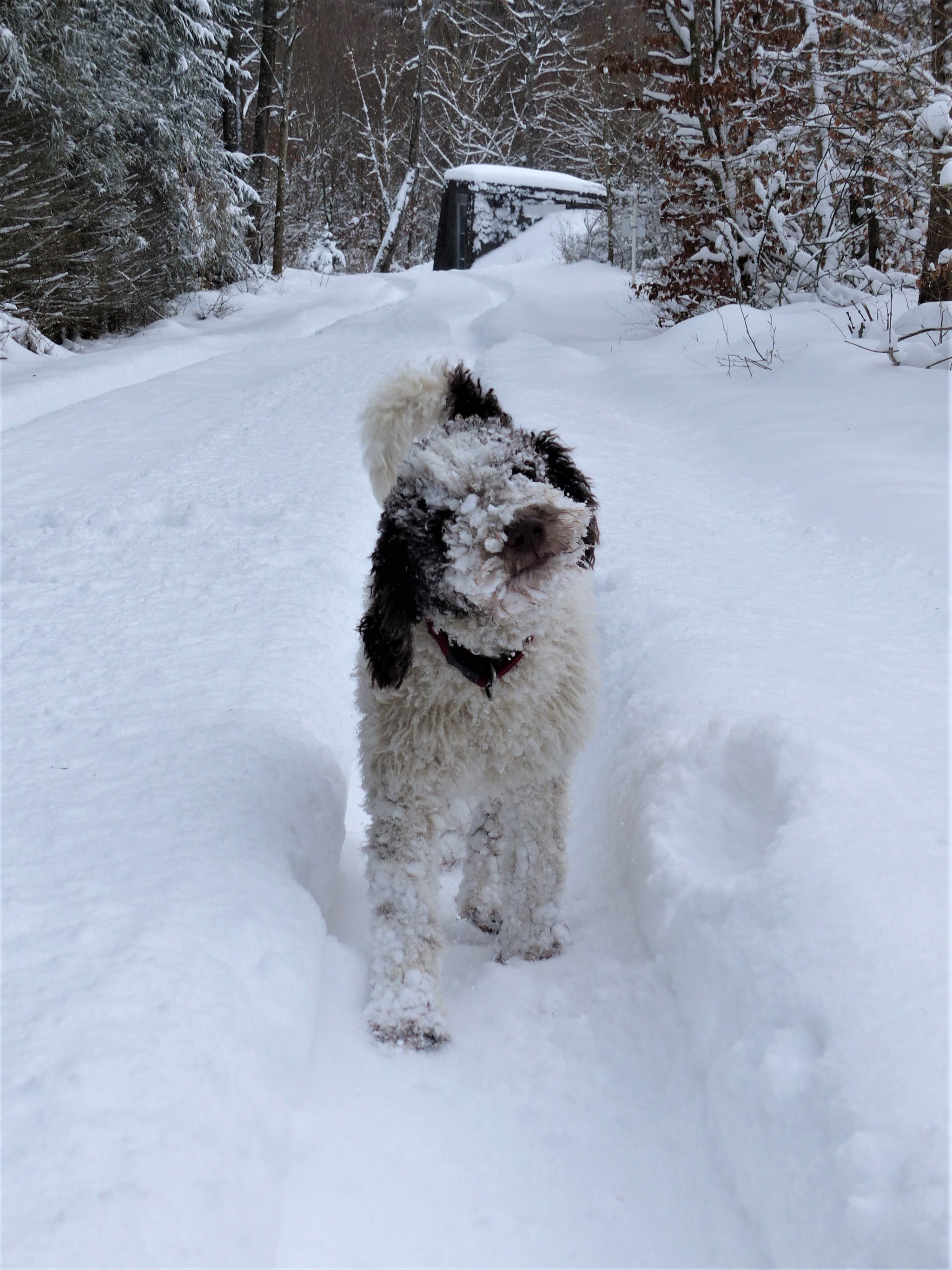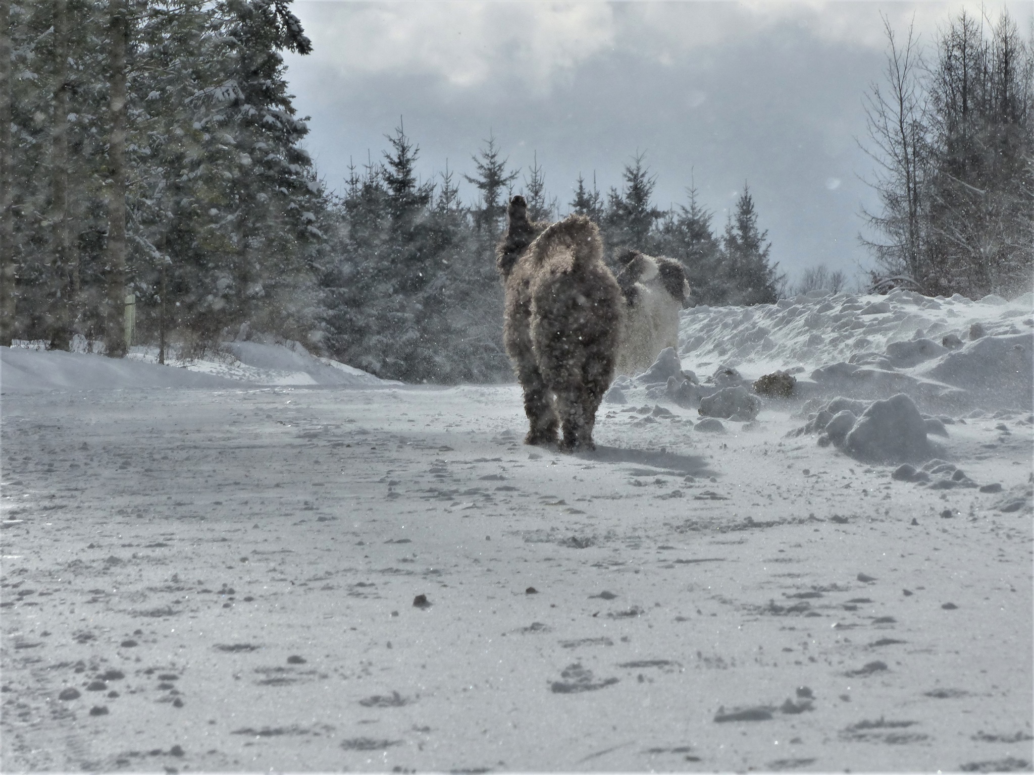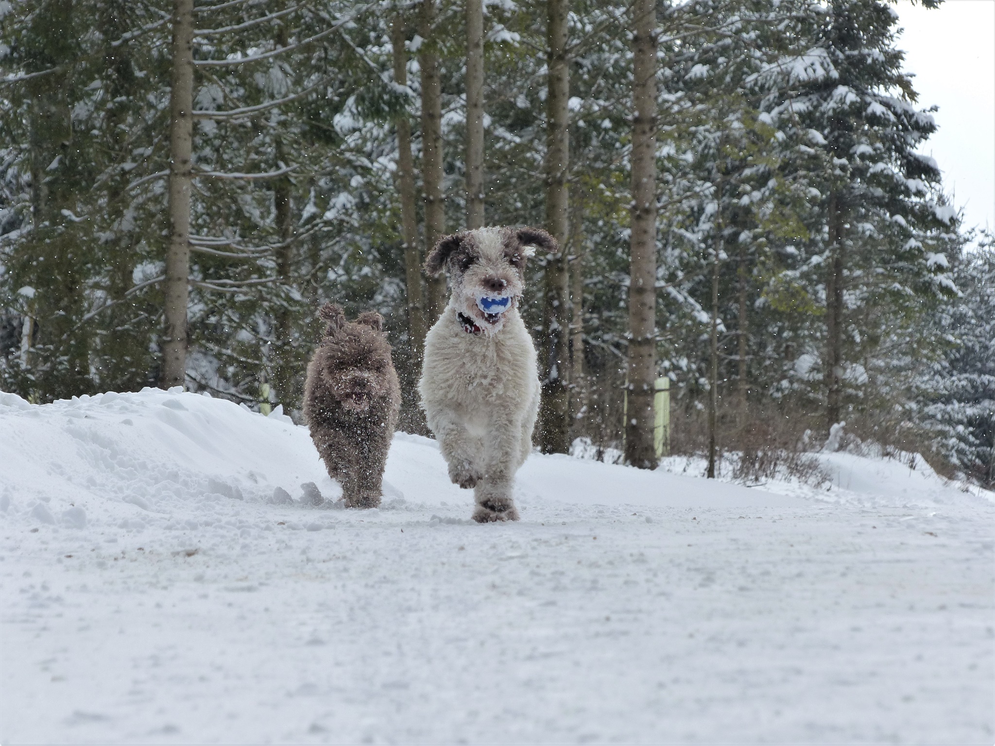 Wir laufen in der schönen Natur vor unserer Haustür mit unseren nicht mehr ganz jungen, aber ganz schön wilden und genießen den Schnee.