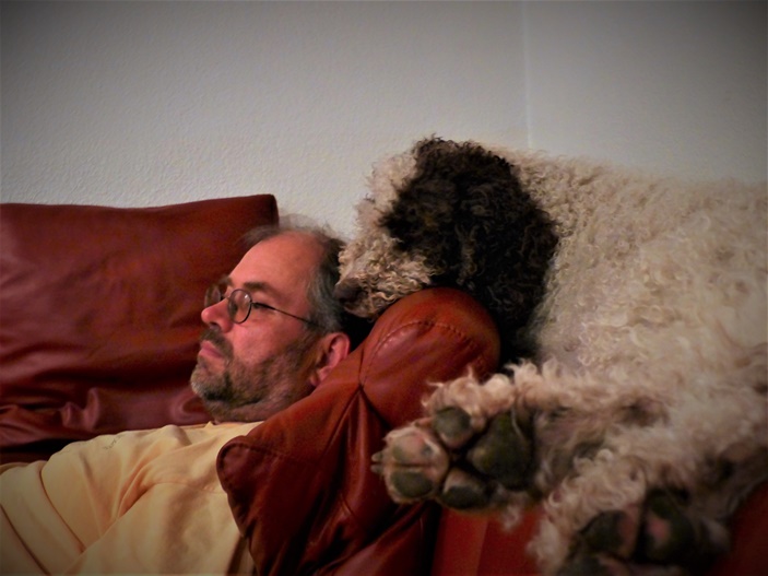 Abends machen wir es uns auf der Couch vor dem Fernseher gemütlich. Emilia sieht mit Herrchen abends gerne mit fern.