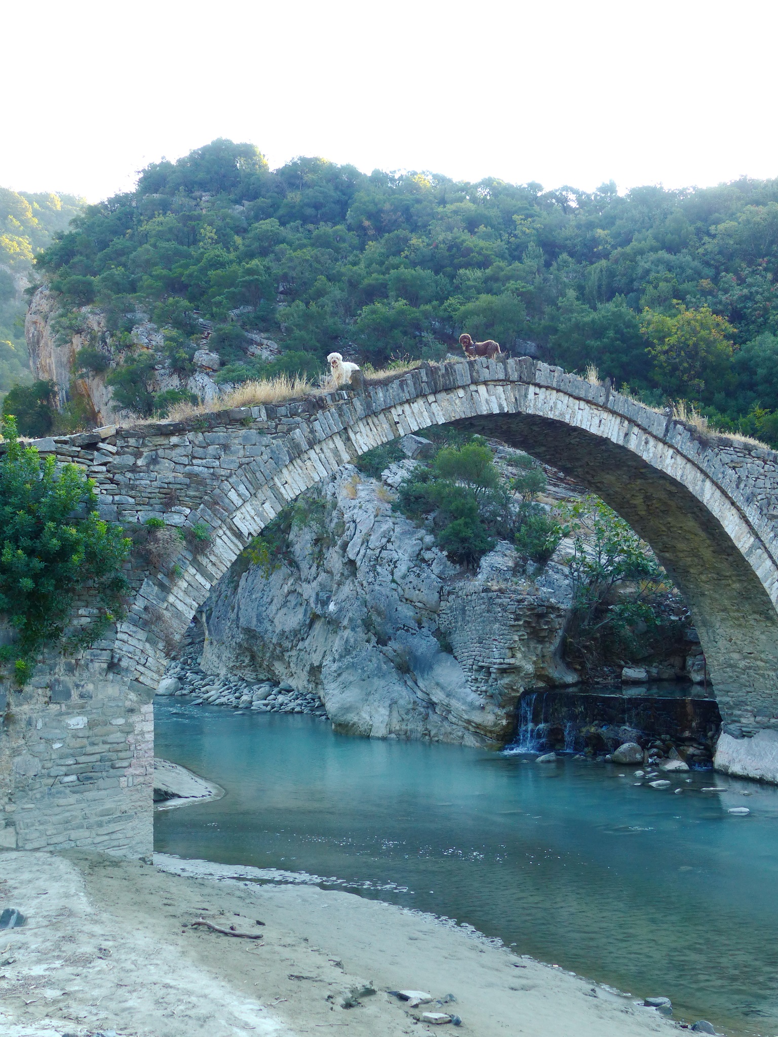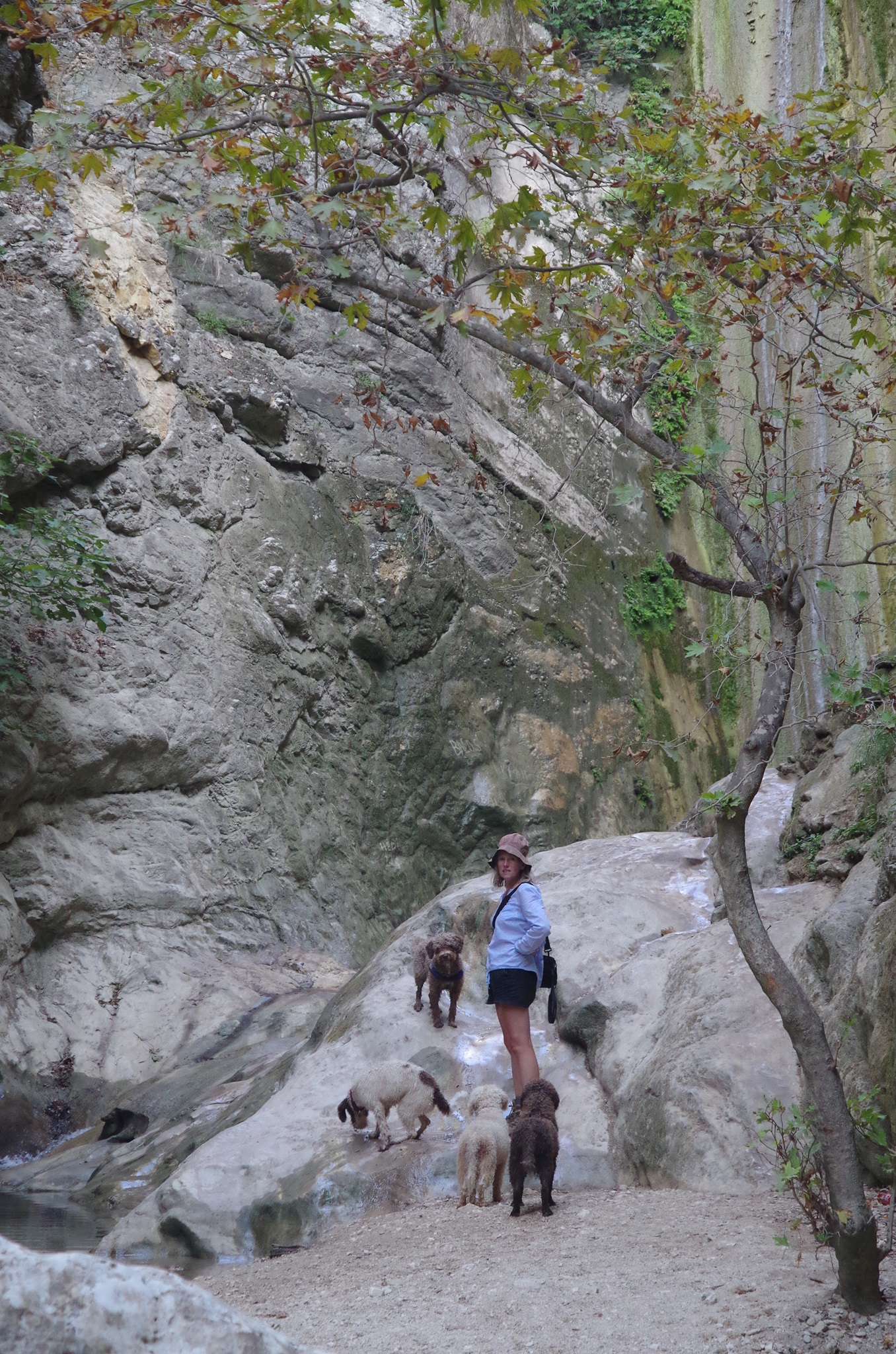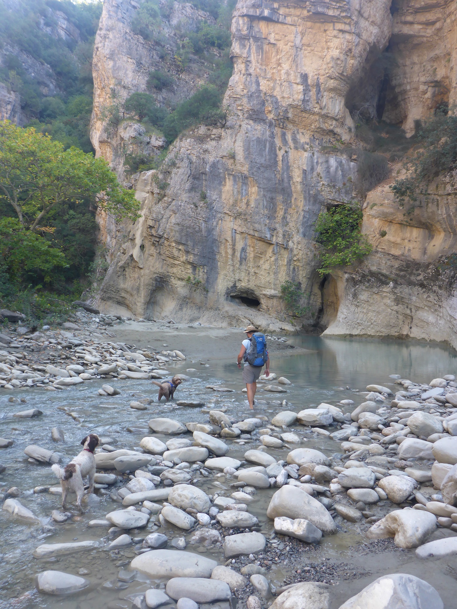 Am nächsten Tag ziehen wir die Wanderschuhe an und machen eine Wanderung ins wilde Pindos-Gebirge. Den Hunden juckt es schon in den Pfoten. Die Eichen weichen riesigen uralten Laubbäumen. Die Hunde laufen begeistert und spielen am Wasser.