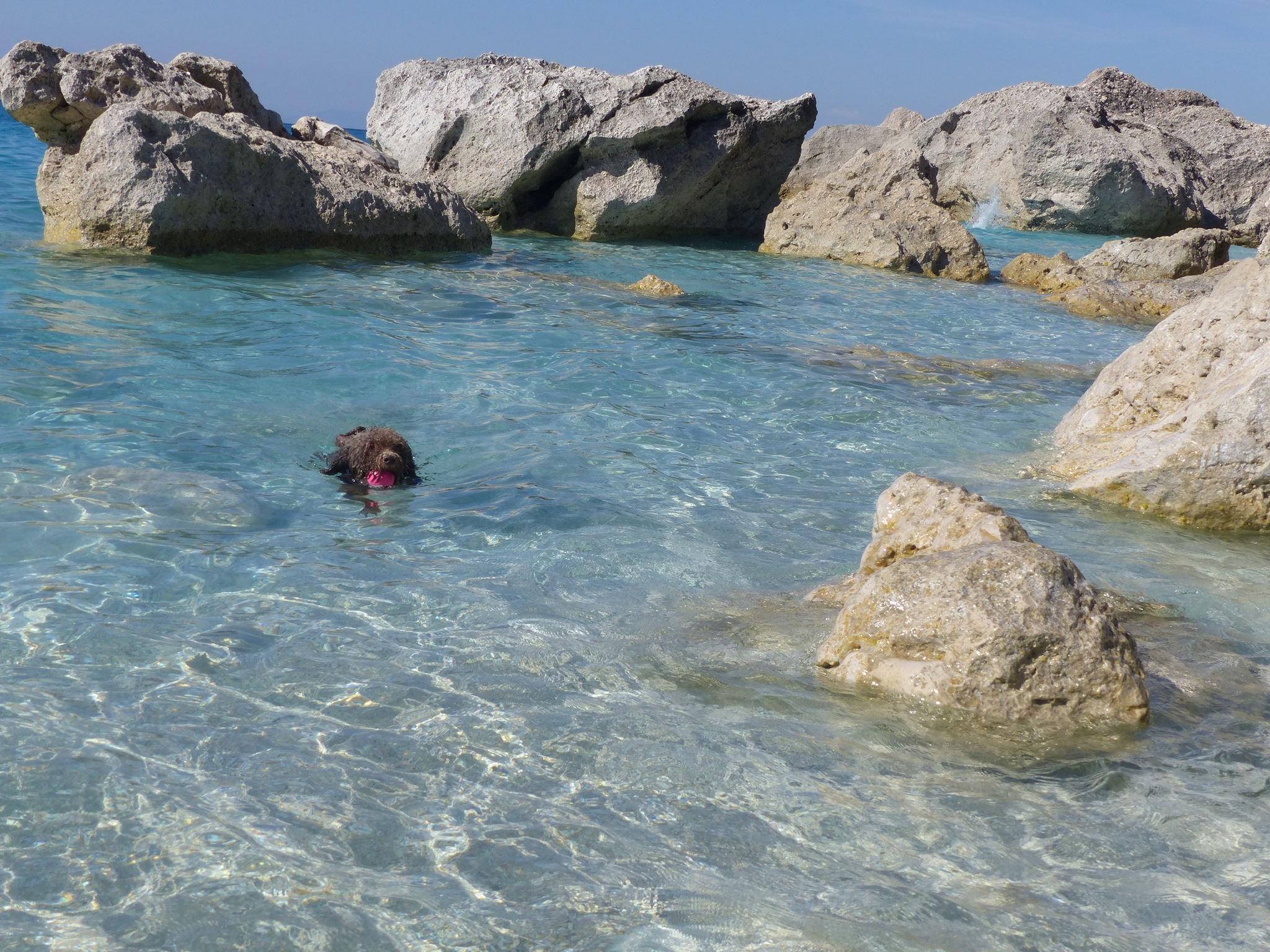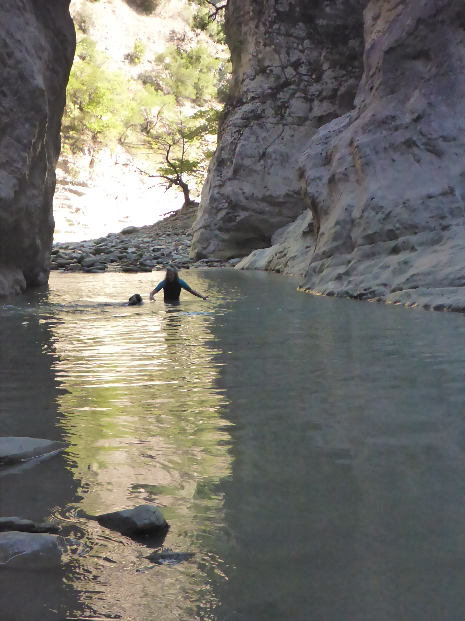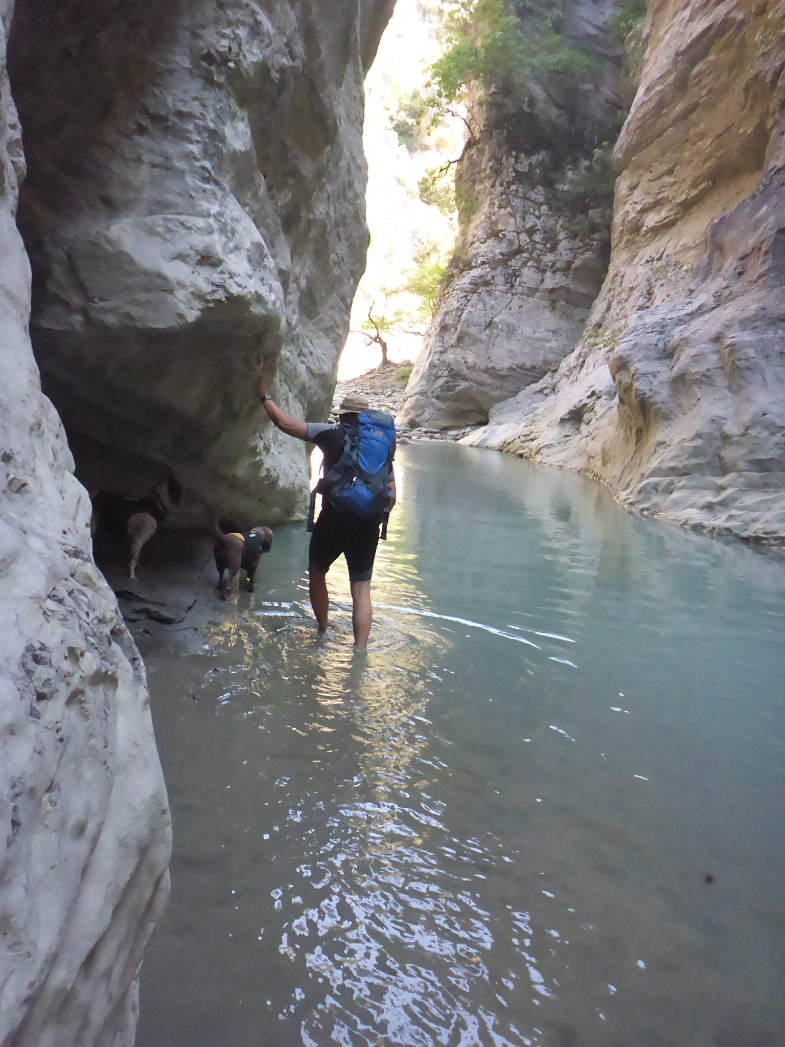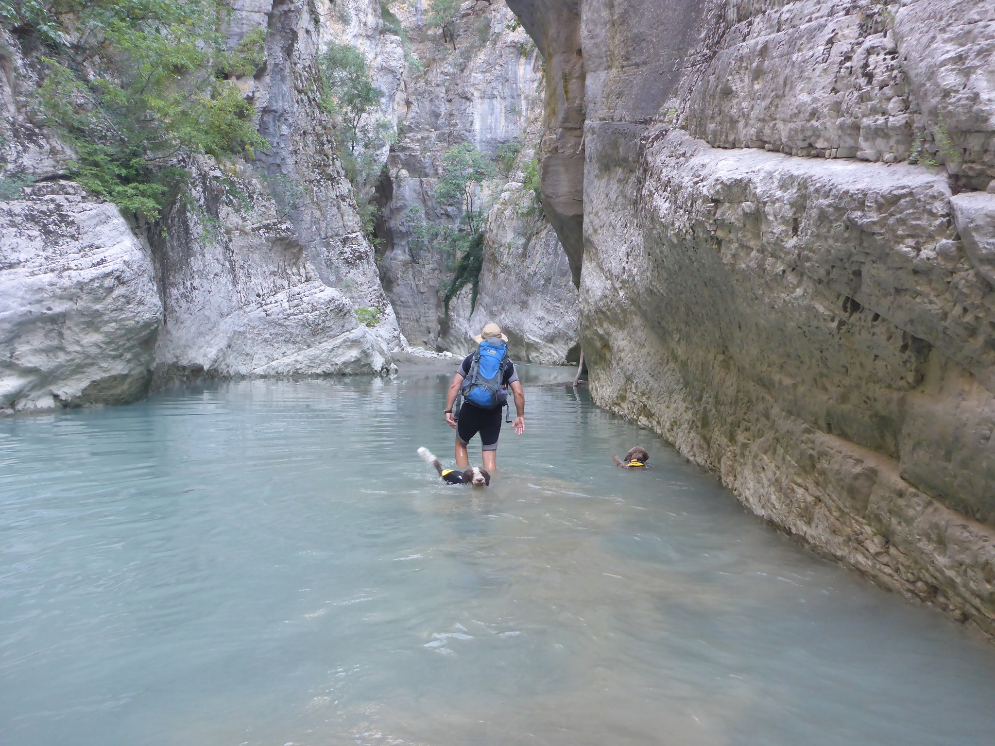 Jetzt, Anfang September, wird es am Morgen schnell knackig warm. Ein Bad in den Bächen und Wasserfällen, ist dann eine willkommene Abwechslung, wenn man sich auf eine Wanderung durch die unberührte Landschaft macht. Wir erkunden die Berglandschaft auf schmalen Wegen, die durch tief eingeschnittene Schluchten führen. Wir laufen durch den Canyon, der nur zu Fuß erreichbar ist, es ist herrlich und ein Erlebnis! Bei Schwimmausflügen, wenn wir längere Strecken schwimmen, packen wir die Schwimmwesten ein. Chipsy ist ganz stolz auf ihre neue todschicke schwarz mit quietschegelb Neoprenschwimmweste. Sie ist ja schon etwas älter und sinkt mit dem Hinterleib tiefer ein, was für sie eine Entlastung ist.