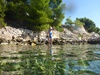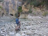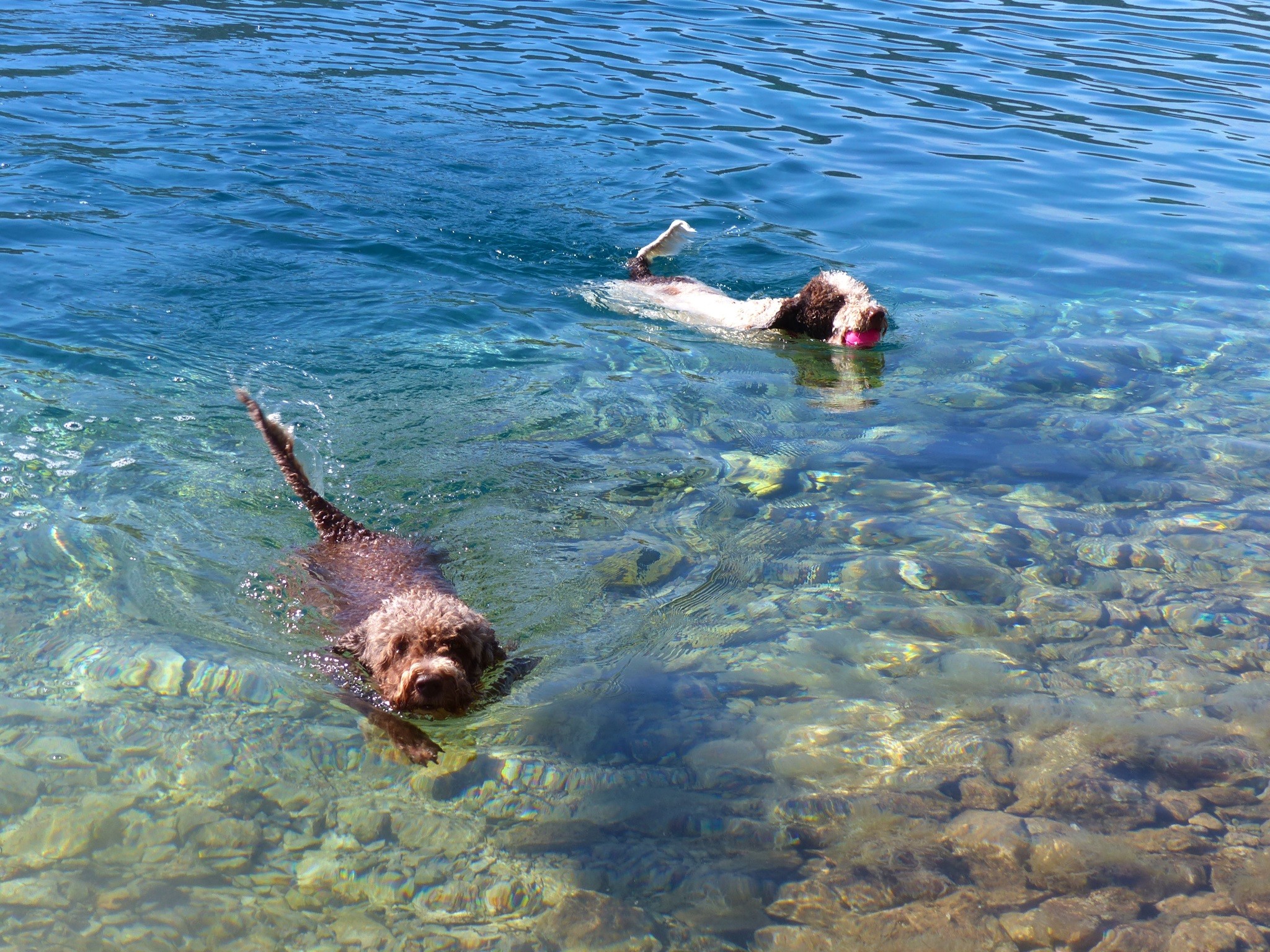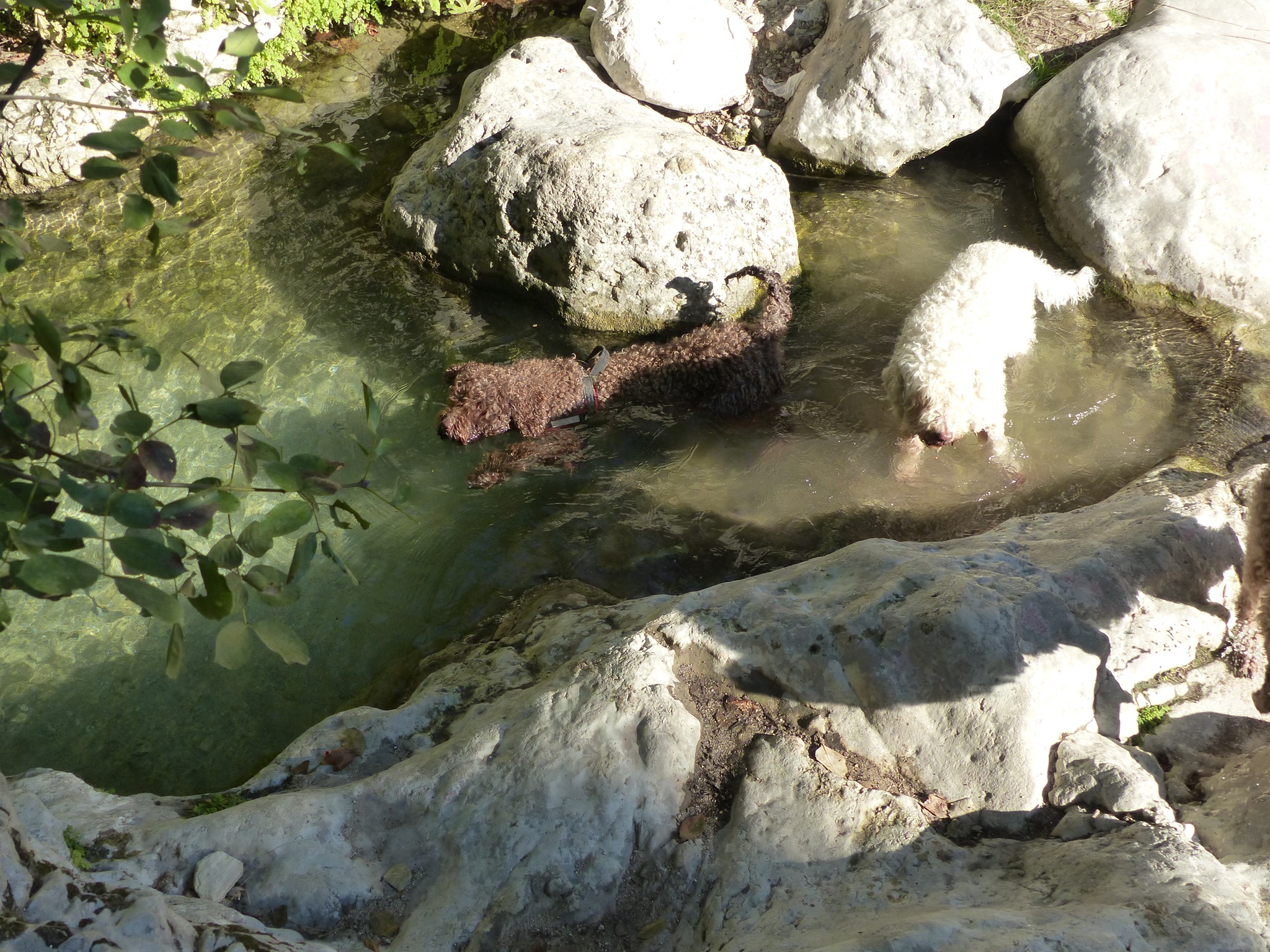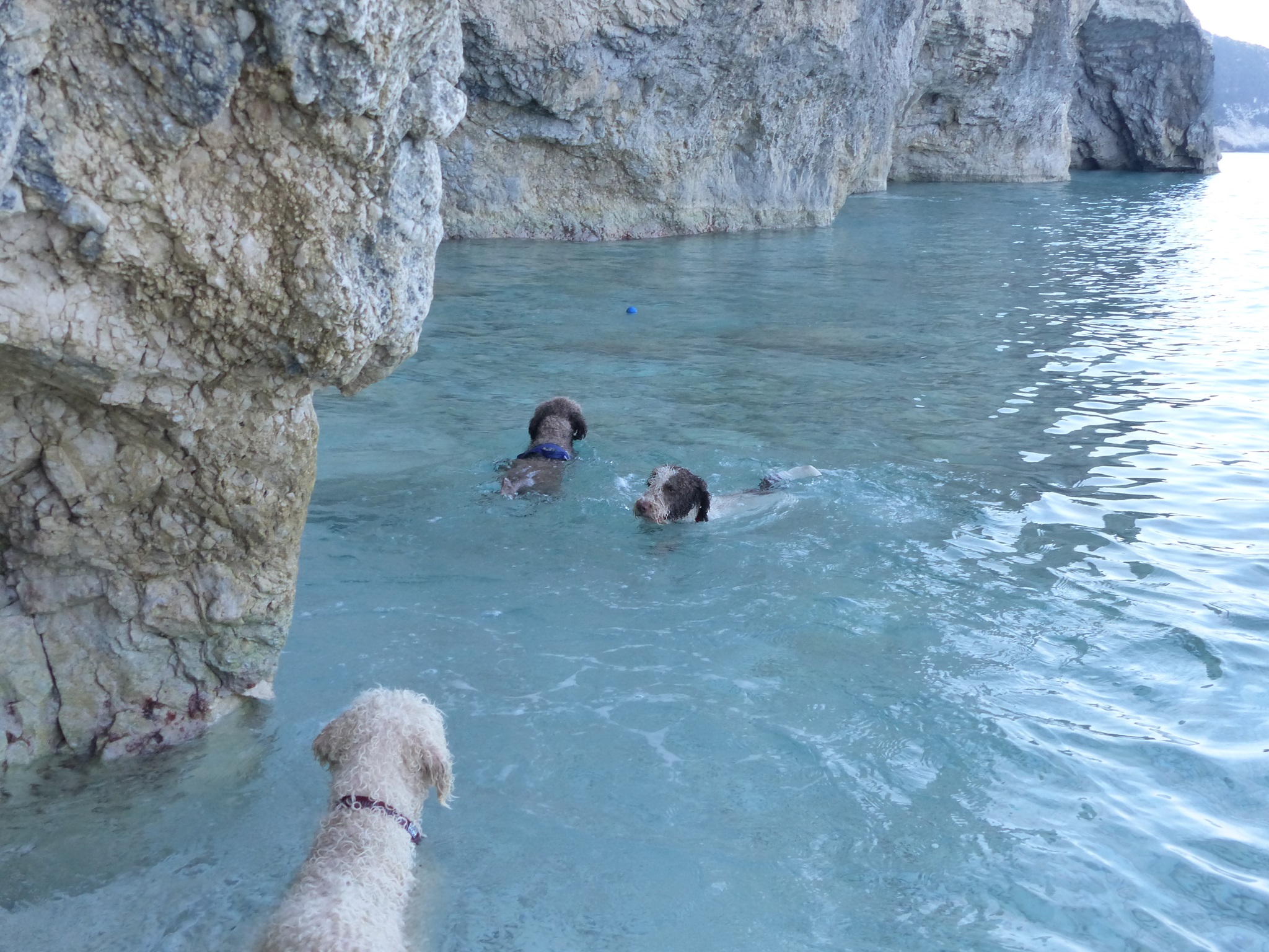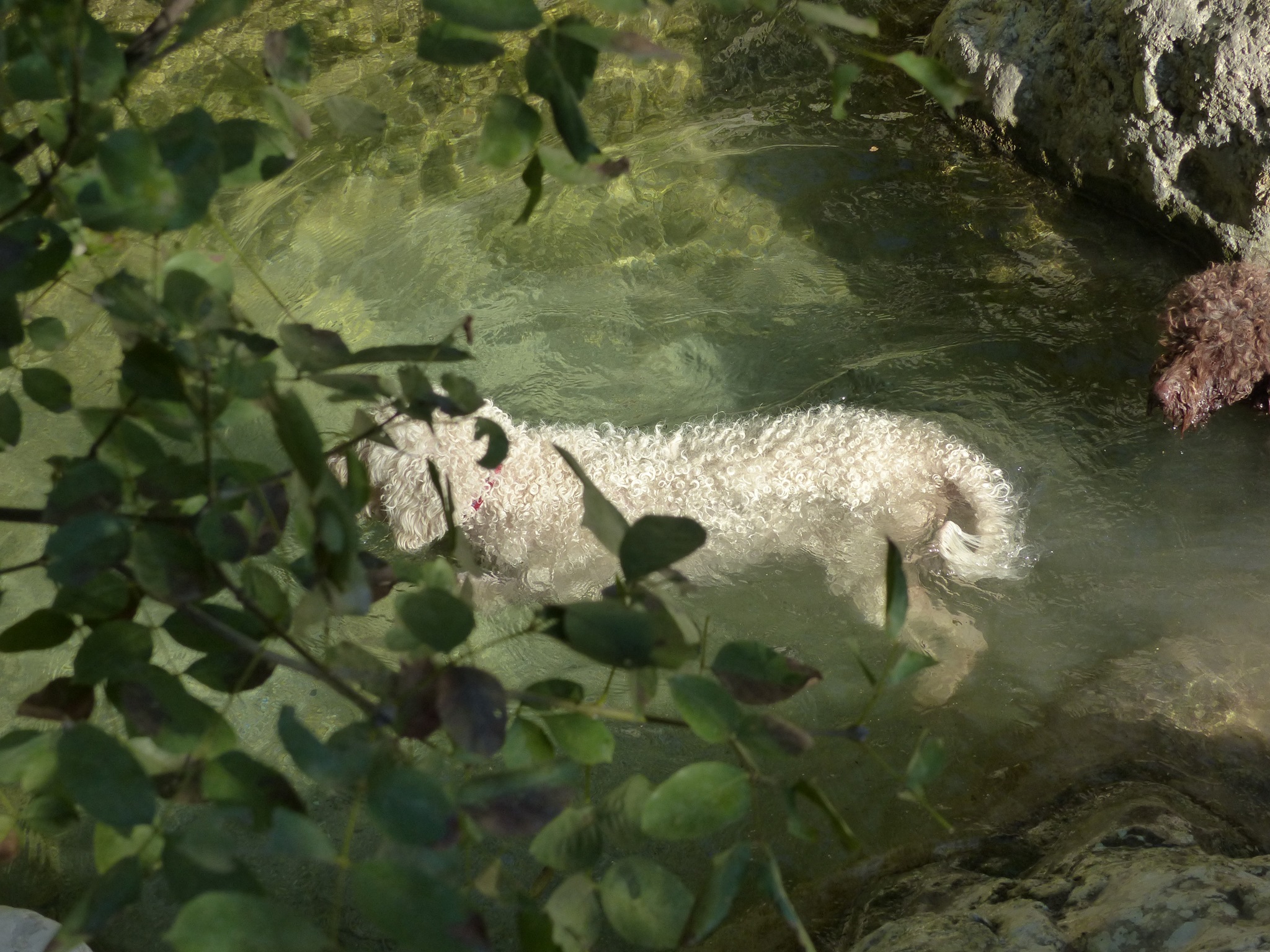 Jetzt, Anfang September, wird es am Morgen schnell knackig warm. Ein Bad in den Bächen und Wasserfällen, ist dann eine willkommene Abwechslung, wenn man sich auf eine Wanderung durch die unberührte Landschaft macht. Wir erkunden die Berglandschaft auf schmalen Wegen, die durch tief eingeschnittene Schluchten führen. Wir laufen durch den Canyon, der nur zu Fuß erreichbar ist, es ist herrlich und ein Erlebnis! Bei Schwimmausflügen, wenn wir längere Strecken schwimmen, packen wir die Schwimmwesten ein. Chipsy ist ganz stolz auf ihre neue todschicke schwarz mit quietschegelb Neoprenschwimmweste. Sie ist ja schon etwas älter und sinkt mit dem Hinterleib tiefer ein, was für sie eine Entlastung ist.