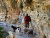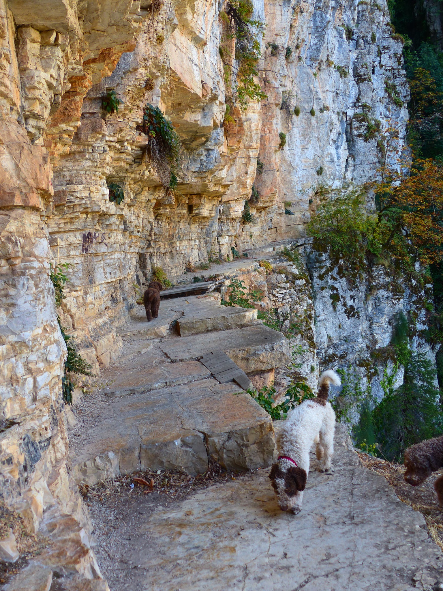 Wir wandern in der Vikos Schlucht. Die Vikos-Schlucht ist die tiefste Schlucht der Welt! Mehrere hundert Meter geht es hier senkrecht herab. Ein 12 Kilometer langer Wanderweg führt bis nach Monodendri und dauert ungefähr sieben Stunden. Da wir zwei Seniorenhunde bei uns haben, können wir nur einen Teil dieser Tour laufen, obwohl Chipsy und Leya noch recht rüstig auf den Beinen sind. Vom verlassenen Kloster führt ein abenteuerlicher, atemberaubender, teilweise in den Fels geschlagenen Weg, hart am steil abfallenden Felsen entlang, hinauf zu einer verlassenen Einsiedelei mit herrlichem Blick in die Vikos-Schlucht (wirklich nur für schwindelfreie, wir hatten weiche Knie) geeignet. Ein zum Ende 50 cm breiter Weg in die 900 Meter tiefe Schlucht.