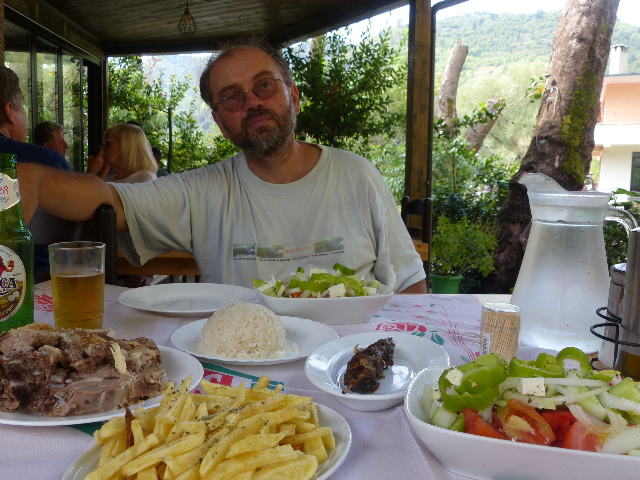 Wir essen „Landestypisch“. Die Speisekarte nur auf Albanisch, der Kellner sehr hilfsbereit, konnte aber kein Wort Englisch. So fragten wir einfach nach der Spezialität des Hauses. Es gab Kukurec. Das Fleisch roch sehr streng und schmeckte nach Hammel. Später haben wir im Reiseführer erfahren, was wir gegessen haben. Kukurec sind kleingeschnittene in Milch eingelegt Schaf- oder Ziegendärme in Soße :o)