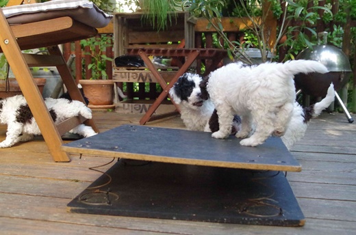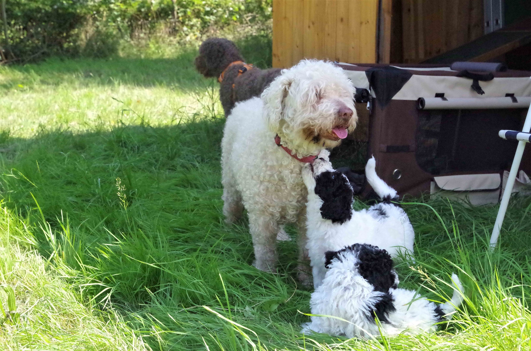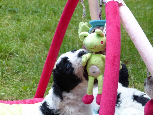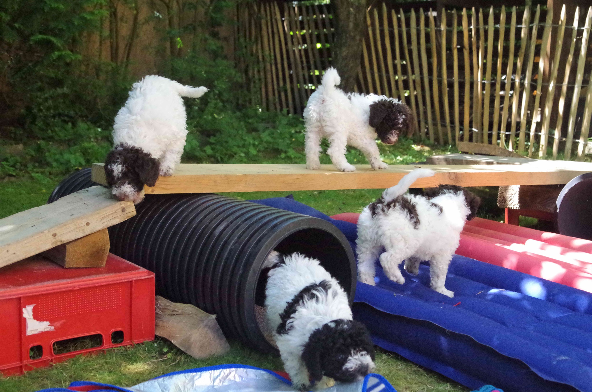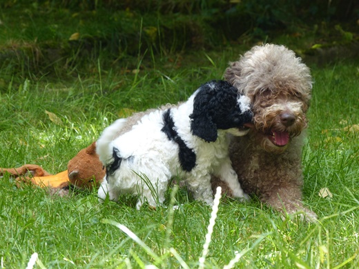 Die Welpen werden von Bonnie dauerbespielt. Danach sind die kleinen Kacker so fertig, dass sie keine Kapazitäten mehr für Trampeltouren über Ur-Oma Leya haben.