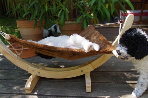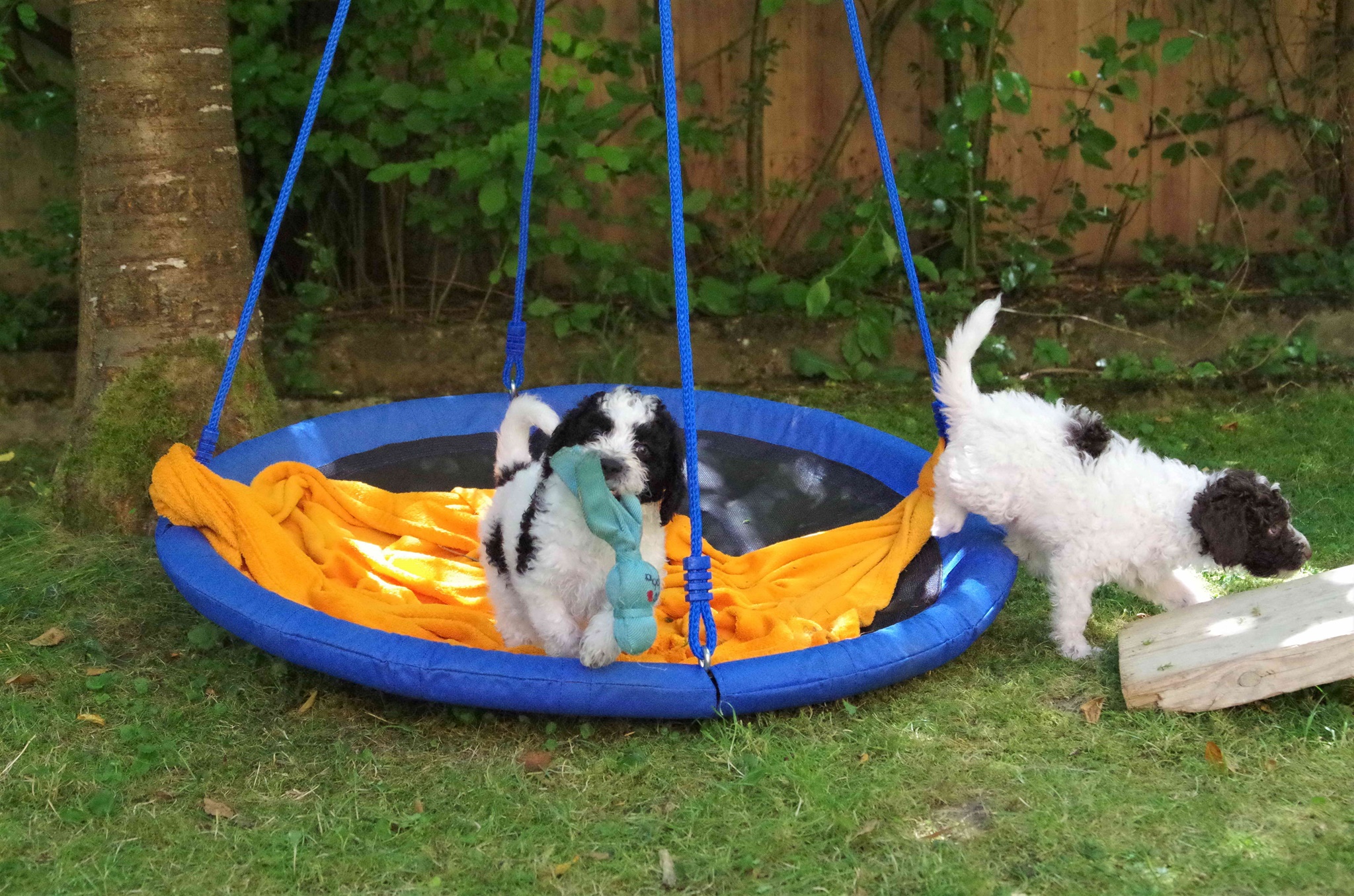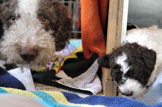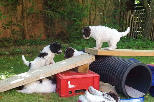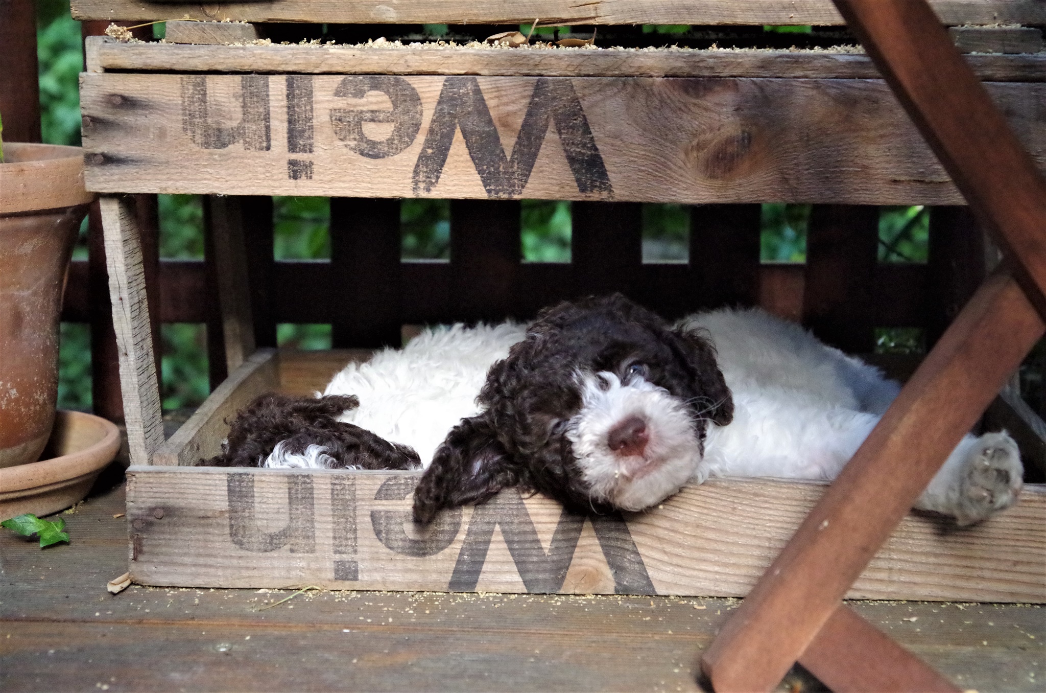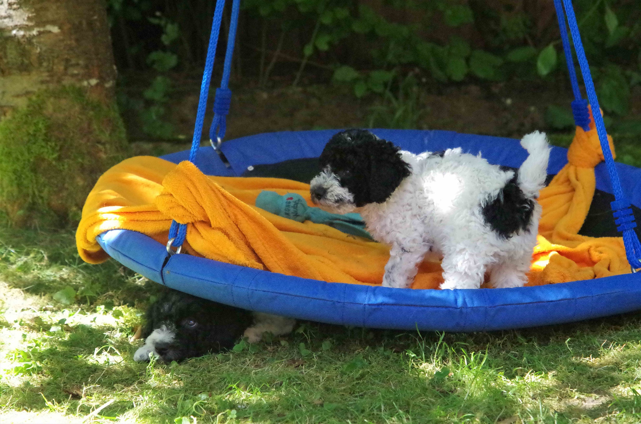 Die Welpen werden von Bonnie dauerbespielt. Danach sind die kleinen Kacker so fertig, dass sie keine Kapazitäten mehr für Trampeltouren über Ur-Oma Leya haben.
