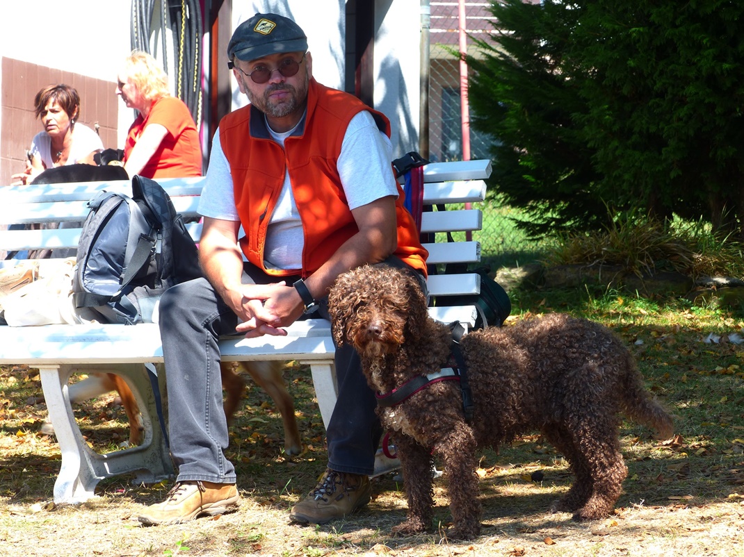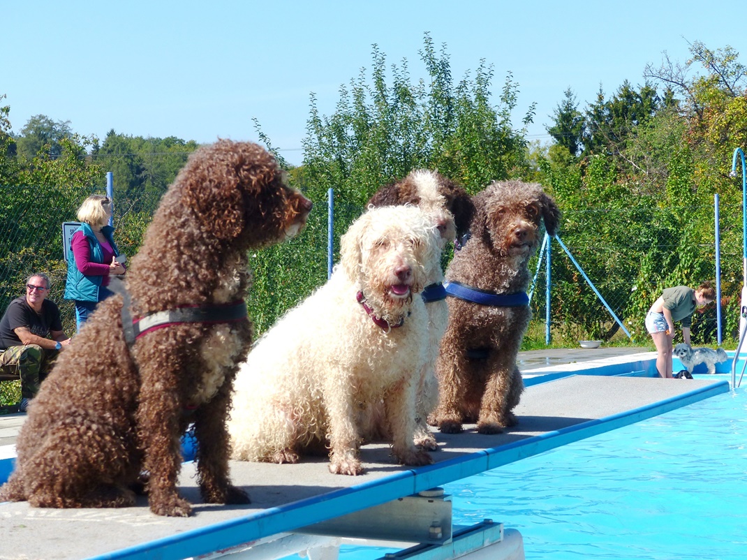 Nach den kühlen Nächten in letzter Zeit wurde die Wassertemperatur gerade mal 15 Grad gemessen. Das Wasser kommt ausschließlich aus einer Quelle. Frauchen war´s dann doch zu frisch. Die Hunde hatten einen Riesenspaß. Das Springen vom Beckenrand ist heute erlaubt :-) Emi stürzte sich in den sportlichen Konkurrenzkampf mit Mama Bonnie besonders im Kampf um den Ball und rennt, dass die Ohren fliegen. Unser Lockenflip Emilia teilt mit Leya die Begeisterung für Wasser, mit Bonnie hingegen die Jagd auf Bälle, wobei Emi ihre Technik perfektioniert hat und seitdem Bonnie nun den einen oder anderen Ballverlust hinnehmen muss. Um bei Leya an den Ball zu kommen, muss Emi aber noch einige Teller leer essen, denn Oma Leya ist ein kleines Kraftmonster, während Emi noch ein arger Spargeltarzan ist, obwohl sie es bei Oma leichter hat, die lässt sich doch irgendwie besser unterdrücken… Nach dem Baden und einem Stück Kuchen mit diversen Kaffees ging es für uns dann los in den Urlaub.