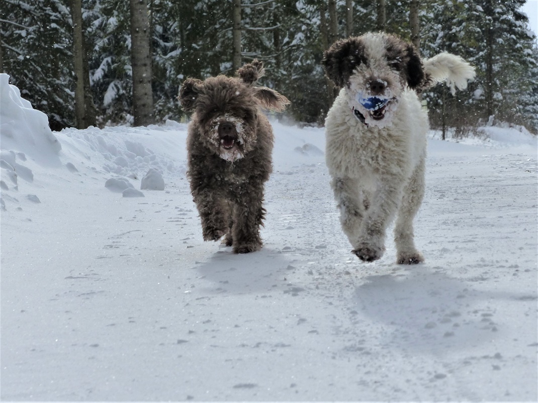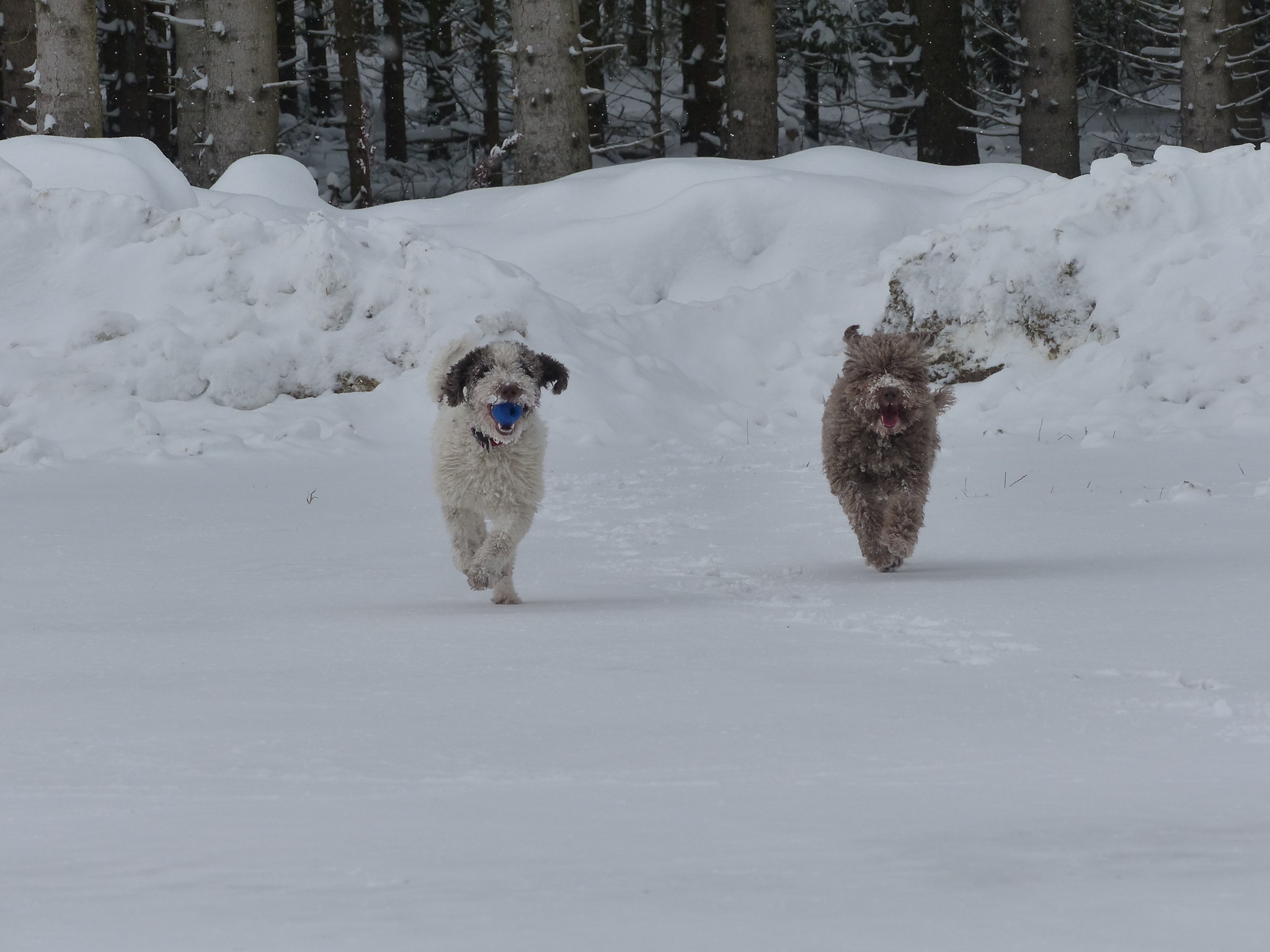 Wir laufen in der schönen Natur vor unserer Haustür mit unseren nicht mehr ganz jungen, aber ganz schön wilden und genießen den Schnee.