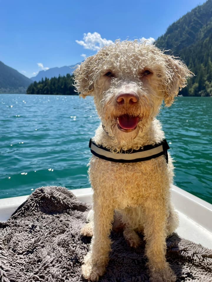 Bonnie ist super! Auch mit 14 noch top fit und springt mit Schwimmweste ins Wasser, geht nur unter, bis die Luftpolster am Wasser aufliegen und kommt mit Schwimmhilfe selten bis gar nicht mit dem Kopf unter Wasser.