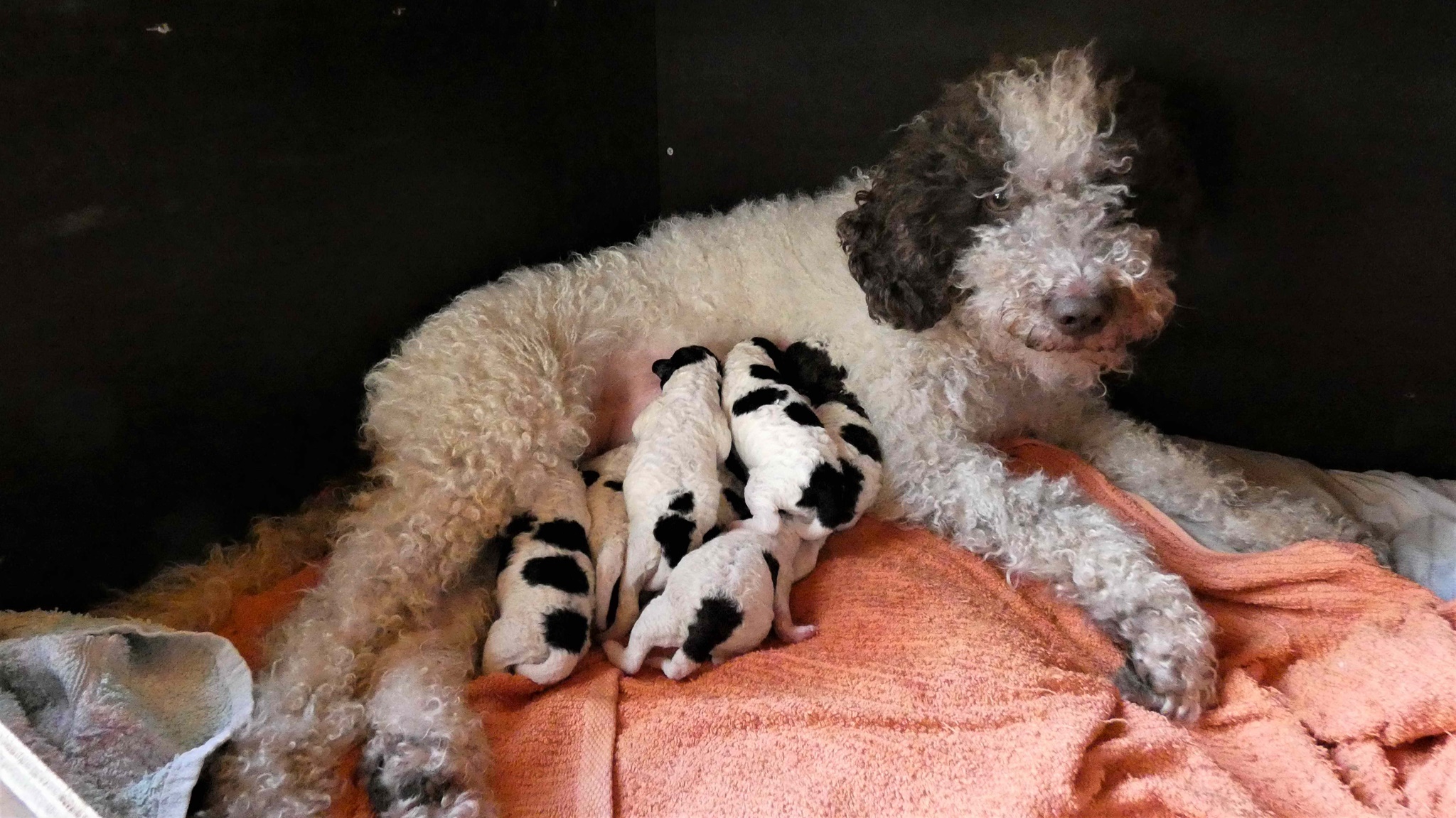 Kurz gesagt: wir haben 7 wunderschöne Welpen, 2 Jungs in weiß-braun und 5 Mädels, 1 in weiß-braun, 4 in weiß-schwarz. Dicke Köpfe, runde Schnauzen. Es geht allen gut. Es wird fleißig getrunken und viel geruht.
