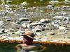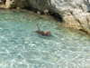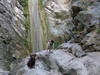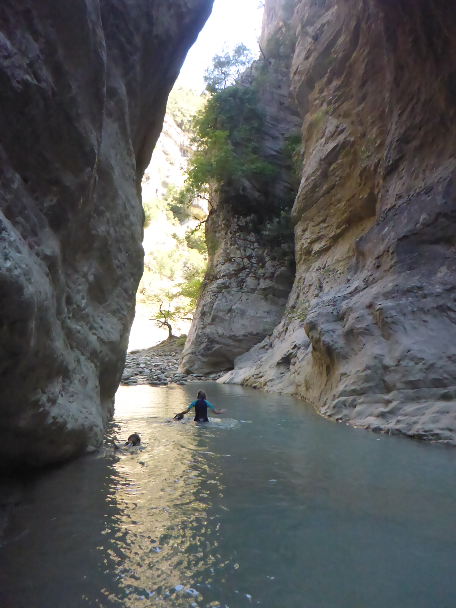 Jetzt, Anfang September, wird es am Morgen schnell knackig warm. Ein Bad in den Bächen und Wasserfällen, ist dann eine willkommene Abwechslung, wenn man sich auf eine Wanderung durch die unberührte Landschaft macht. Wir erkunden die Berglandschaft auf schmalen Wegen, die durch tief eingeschnittene Schluchten führen. Wir laufen durch den Canyon, der nur zu Fuß erreichbar ist, es ist herrlich und ein Erlebnis! Bei Schwimmausflügen, wenn wir längere Strecken schwimmen, packen wir die Schwimmwesten ein. Chipsy ist ganz stolz auf ihre neue todschicke schwarz mit quietschegelb Neoprenschwimmweste. Sie ist ja schon etwas älter und sinkt mit dem Hinterleib tiefer ein, was für sie eine Entlastung ist.