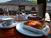 Im Dorf essen wir Hähnchen-Pita, Bauernsalat, Schafsjoghurt mit Honig und Früchten. Eine einfache Holzplattform mit 4-5 einfachen Tischen und Bänken. Die Speisekarte klein aber fein, das Gemüse, der Joghurt, alles aus eigenem Anbau und Bio.