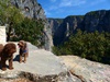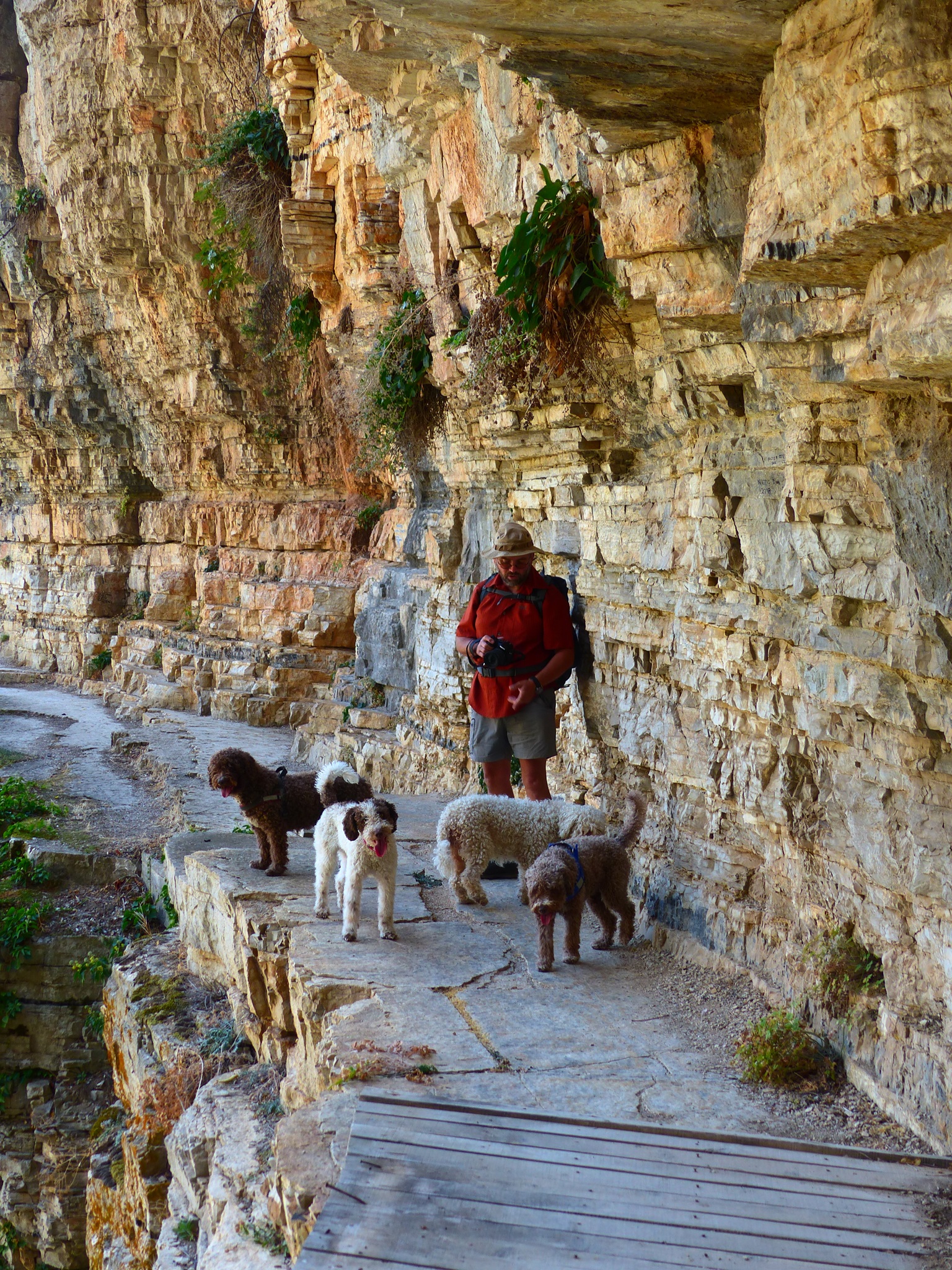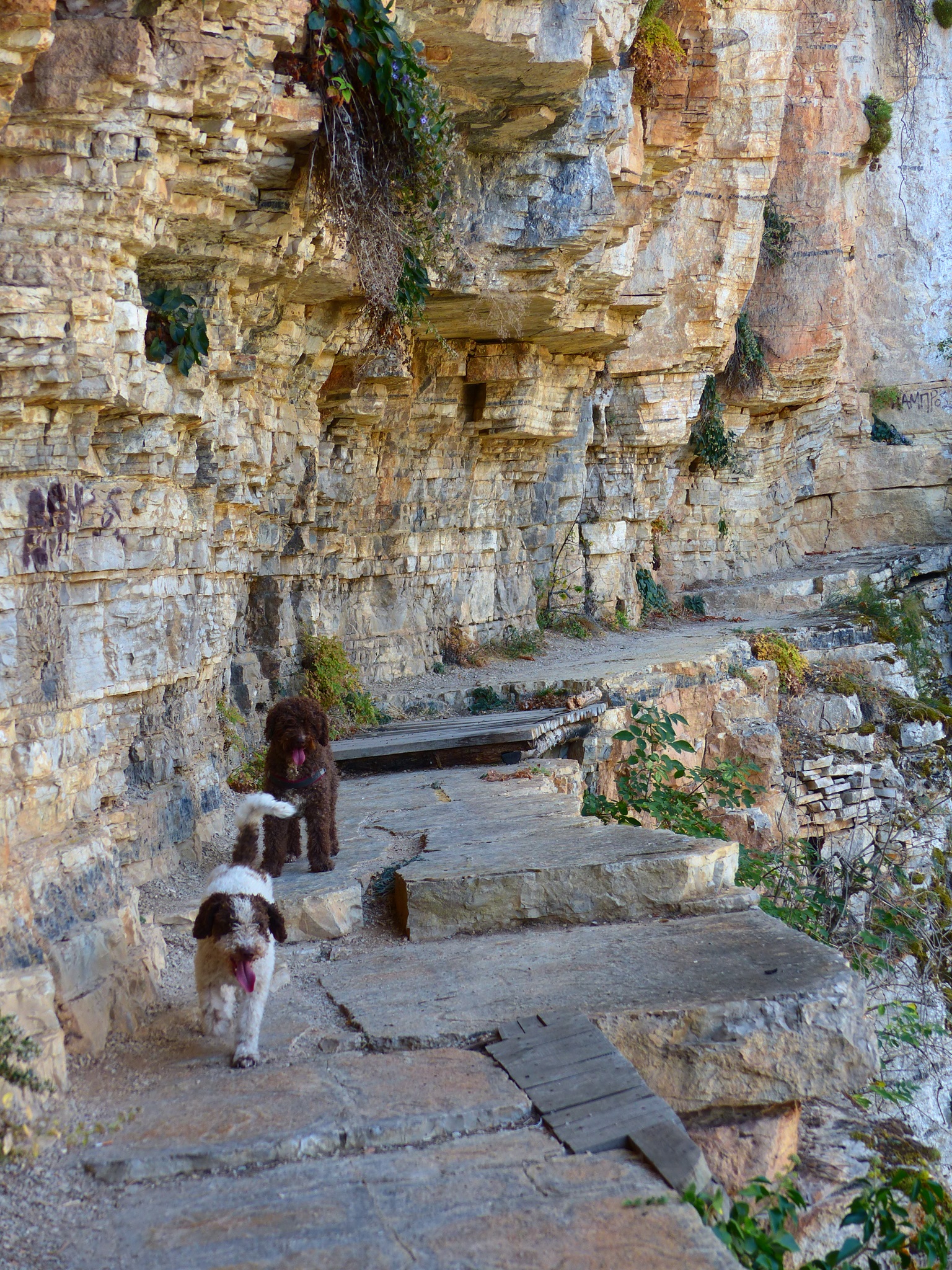 Wir wandern in der Vikos Schlucht. Die Vikos-Schlucht ist die tiefste Schlucht der Welt! Mehrere hundert Meter geht es hier senkrecht herab. Ein 12 Kilometer langer Wanderweg führt bis nach Monodendri und dauert ungefähr sieben Stunden. Da wir zwei Seniorenhunde bei uns haben, können wir nur einen Teil dieser Tour laufen, obwohl Chipsy und Leya noch recht rüstig auf den Beinen sind. Vom verlassenen Kloster führt ein abenteuerlicher, atemberaubender, teilweise in den Fels geschlagenen Weg, hart am steil abfallenden Felsen entlang, hinauf zu einer verlassenen Einsiedelei mit herrlichem Blick in die Vikos-Schlucht (wirklich nur für schwindelfreie, wir hatten weiche Knie) geeignet. Ein zum Ende 50 cm breiter Weg in die 900 Meter tiefe Schlucht.